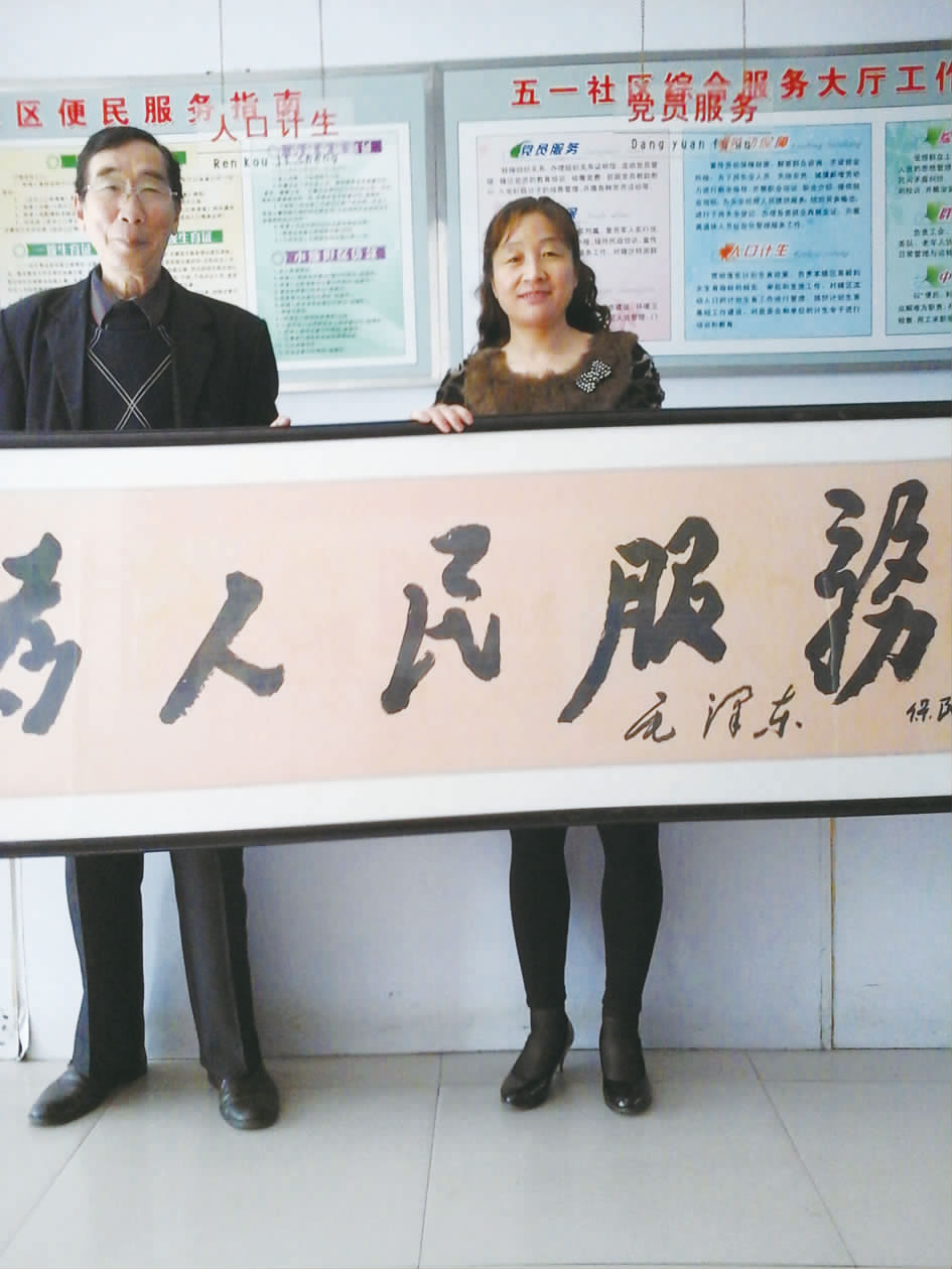4月9日上午10时许,中州轮胎4号家属院的居民代表刘振山(左)夫妇为五一社区送来“为人民服务”的牌匾,以表达社区为居民办实事的感激之情。